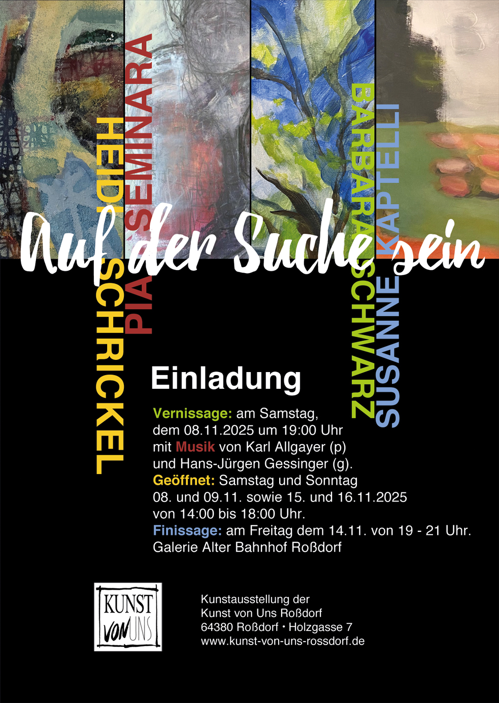 "Auf der Suche sein" titelt unsere nächste Ausstellung. Die Künstlerinnen Susanne Kaptelli, Heidi Schrickel, Barbara Schwarz und Pia Seminara zeigen ihre Werke und lassen sich gerne auf Gespräche ein. DIe Vernissage findet am Samstag, dem 08. November 2025 um 19:00 Uhr in der Galerie Alter Bahnhof statt! Ab 19:00 Uhr gibt es Live-Musik mit Karl Allgayer am Keyboard und Hans-Jürgen Gessinger an der Gitarre! Wir freuen uns auf Ihren Besuch. Die Ausstellung ist außerdem geöffnet Samstags am Sonntags, bis zum 16. November von 14:00 bis 18:00 Uhr. Am Freitag, dem 14. 11. veranstalten wir eine Midissage von 19:00 bis 21:00 Uhr. Zur >> Einladung!
